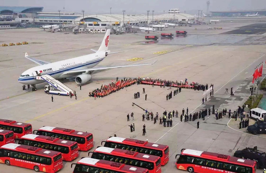下午2點多,在首都機場停機坪,一輛輛北汽福田歐輝新能源高端商務大巴列隊排開,車頭裝飾著綢布紅花,紅色車身張貼著“熱烈歡迎北京援鄂醫療隊凱旋”的標語,靜靜等待著即將抵達的返京醫療隊。終于,醫療隊員們乘坐的航班降落在首都機場,機場以民航界最高禮遇“過水門”迎接英雄,為他們“接風洗塵”。艙門緩緩打開,隊員們手持國旗、鮮花,依次走下舷梯。前來迎接的隊員家屬代表、醫護人員代表、機場工作人員或肅立注目,或揮手歡呼,以各自的方式向這些北京英雄們表達著最崇高的敬意。