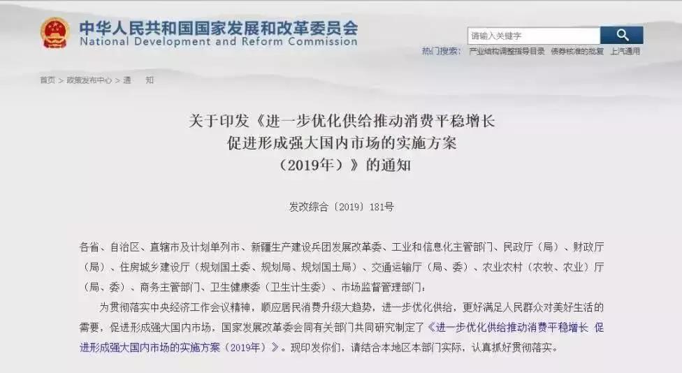 2019年1月29日,國家發(fā)改委等十部門印發(fā)《進一步優(yōu)化供給推動消費平穩(wěn)增長 促進形成強大國內(nèi)市場的實施方案(2019年)》(以下簡稱《方案》)。方案制定六大措施促進汽車消費,涉及老舊汽車報廢更新、新能源補貼、農(nóng)村汽車更新?lián)Q代等方面。《方案》提到,2019年,發(fā)改委將促進農(nóng)村汽車更新?lián)Q代。有條件的地方,可對農(nóng)村居民報廢三輪汽車,購買3.5噸及以下貨車或者1.6升及以下排量乘用車,給予適當補貼,帶動農(nóng)村汽車消費。