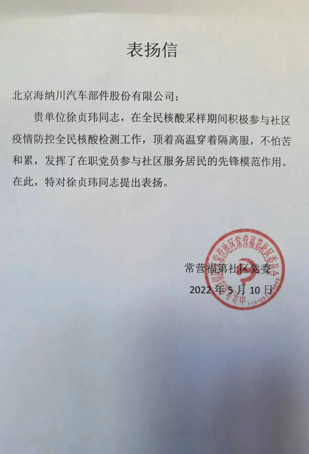 “頂著高溫穿著隔離服,不怕苦和累,發揮了在職黨員參與社區服務居民的先鋒模范作用……”日前,海納川下沉干部徐貞瑋收到一封落款為常營福地社區黨委的表揚信,充分肯定了他的表現。