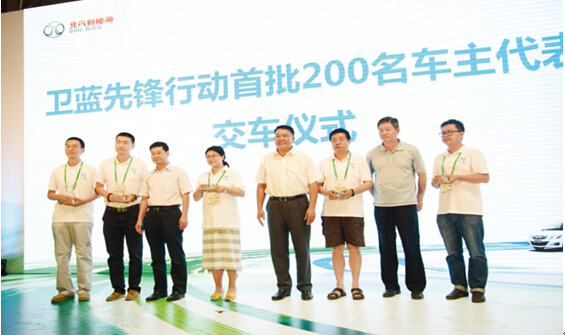 7 月13 日,“衛藍先鋒行動”首批200 名純電動車主交付車輛儀式在北汽新能源公司舉辦。同時還聘請了潘曉婷、顧俊、高敏、楊凌等世界冠軍擔任“北京綠色出行大使”。北京市有關領導出席儀式,北汽集團董事長、副總經理張欣,北汽新能源公司總經理鄭剛一同參加活動。將車鑰匙交給首批“衛藍先鋒”車主代表,并向四位世界冠軍頒發了“北京綠色出行大使”聘書。